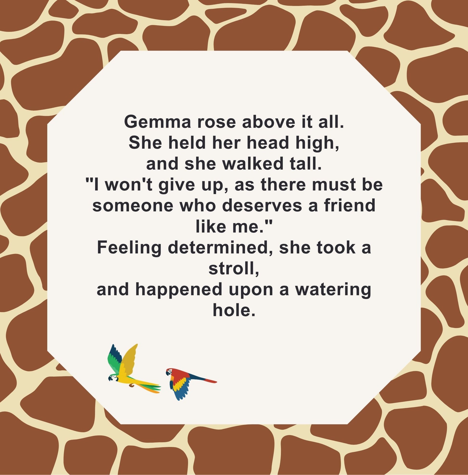 When the jungle animals tell Gemma Giraffe she doesn’t fit in, she goes in search of a group of friends who truly deserve her. But after being told her skin is too spotty, her mouth is too gummy, and she is just too skinny, Gemma begins to give up hope.