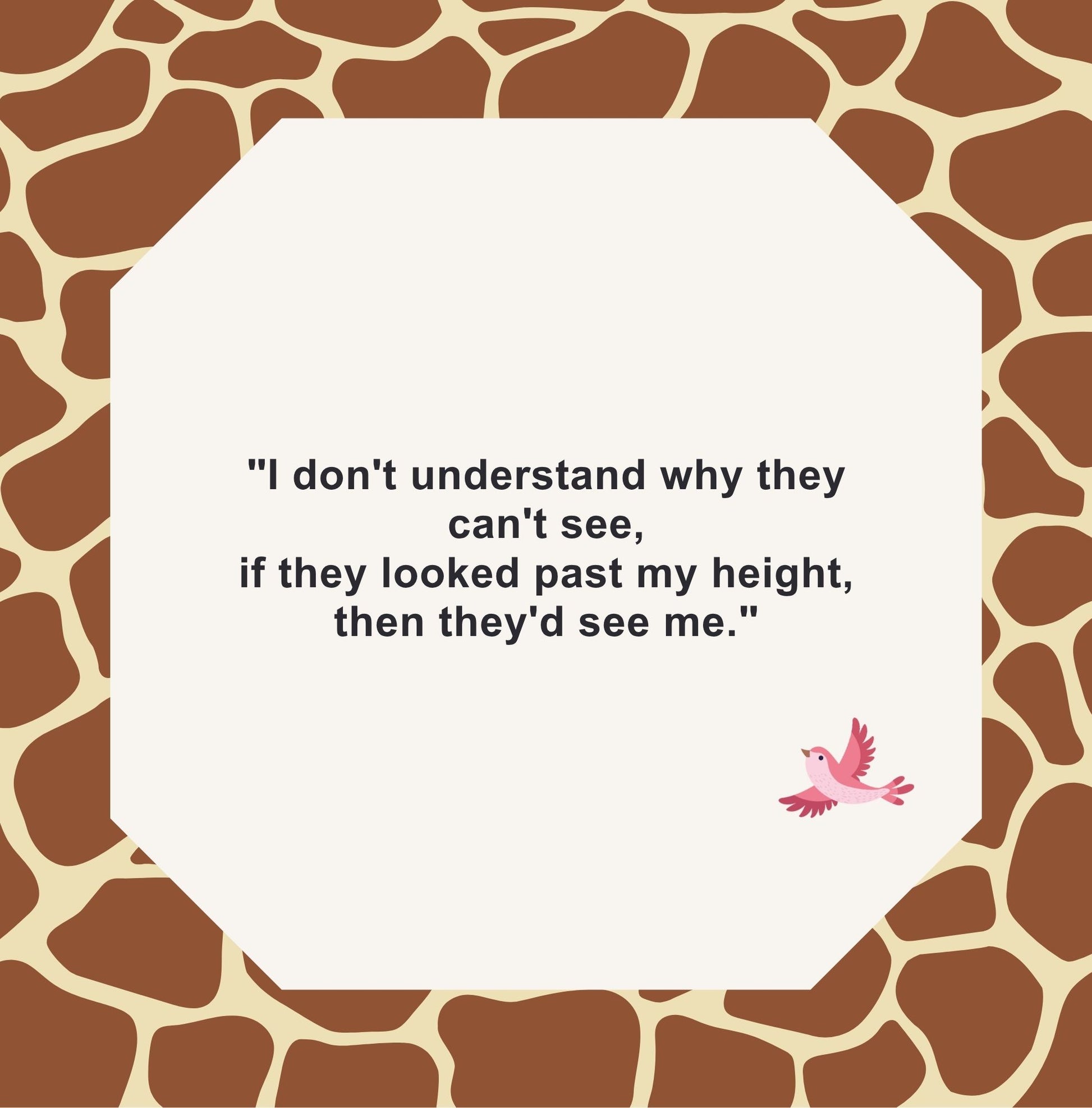 However, Gemma soon realises that she’s been looking in the wrong places. She shouldn’t be looking down at the ground, but up towards the sky, where a flock of new friends will appreciate her for the unique giraffe she is.